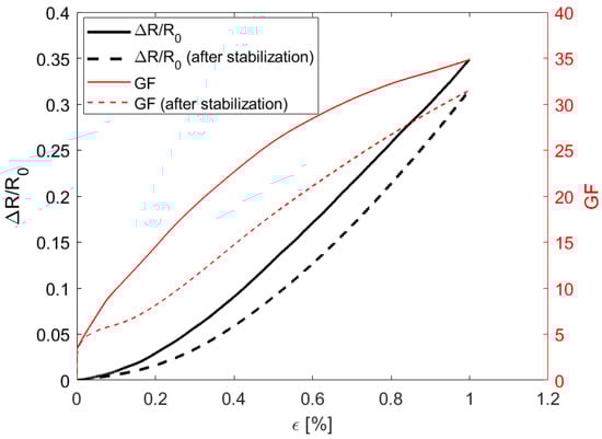 where ∆R = R(ε) − R0 and R0 is the electrical resistance at resting condition. As it is well-known that piezoresistive polymeric sensors require mechanical stabilization [3,29,30], the relative variation in the electrical resistance and GF as function of ε are reported in Figure 12 after subjecting the sample to 50 cyclic flexure loading tests. We noticed that the GF after stabilization was slightly lower than that after the first test. On the one hand, it depends on a higher value of the initial resistance; on the other hand, it depends on the reorganization of a conductive sensing network constituted by the nanofillers dispersed in the polymeric matrix. It can be also noted that the minimum detectable strain is ~0.03% and the maximum sensitivity is ~33 for a strain of 1%, a significantly high value for nanocomposite polymeric strain sensors [31].