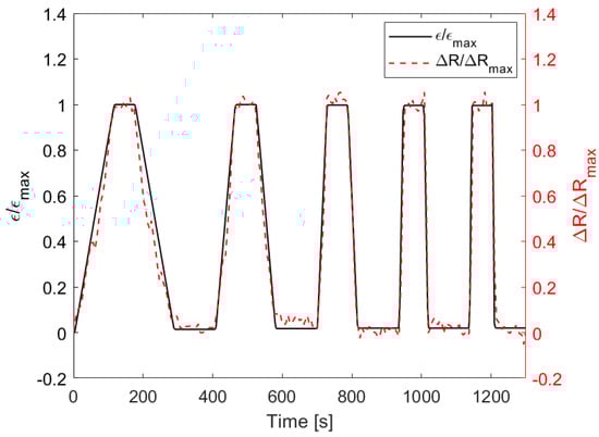 Finally, to verify the quality of the sensor response, we applied the deformation profile shown in Figure 13: it represents a displacement controlled cycled bending test constituted by five loading/unloading phases conducted at five different velocities, increased from 5 mm/min to 40 mm/min. When the maximum strain εmax was reached during the loading phase, it was followed by a period of 60 s with a constant strain. Subsequently, the unloading step began: once the null strain had been reached, the machine again waited 100 s before restarting the loading phase at a higher speed. As can be seen from the figure, the variation in resistance normalized with respect to its maximum value ∆Rmax, corresponding to reaching εmax, accurately follows the ε/εmax profile.