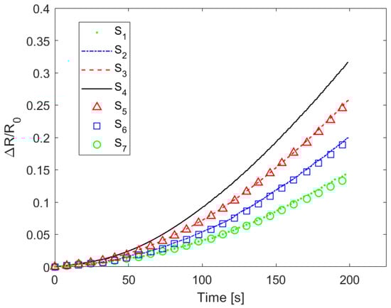 Let us consider, for example, Figure 14, in which we report the relative variation in resistance of the seven sensors as function of time when the beam shown in Figure 5b was subjected to a three-point flexural test. As expected, the sensors closest to the anvils showed lower resistance variation because they were subjected to lower strains. Moreover, the sensors equidistant from S4 showed almost the same response, thus also demonstrating the quality of the manufacturing process developed.