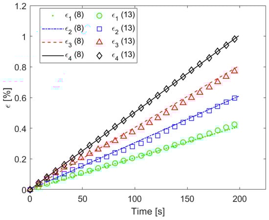Strain vs. time at four different points (x1, x2, x3, x4) of Figure 5 during the three-point bending test obtained either by using Equation (8) (that is, knowing the position of the sensors, the beam geometry and the crosshead deflection vs. time) or by using Equation (13) (that is, from the measurements of the variation in resistance of the sensors and the piezoresistive sensitivity).
