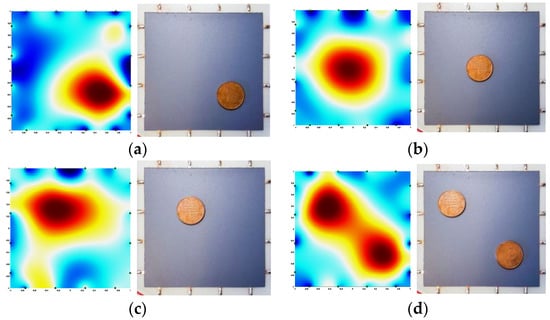 The 100 mm × 100 mm × 1.5 mm square-shaped samples described in Section 2.7 were firstly used to experimentally check the ERT setup by investigating the feasibility of localizing an electrically conducting object placed on the piezoresistive film.