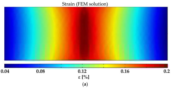 Finally, the system was used to monitor the state of deformation of the rectangular FR4 plate described in Section 2.7 subjected to a 3-point bending test ((Figure 8b) with a span of 160 mm and reaching a maximum flexural strain of 0.2%. COMSOL Multiphysics software was also used for finite element method (FEM) analyses and for predicting the electromechanical response. The dimensions of the substrate, of the coating and of the electrodes, as well as the effective conductivity at rest of the GNP-based paint and its piezoresistive coefficients vs. strain derived from the GF curve in Figure 12, were all inputs for the FEM code. The percentage of variation in the conductivity map obtained by EIDORS and evaluated using the voltages measured at the different electrodes when the maximum flexural strain was applied is reported in Figure 18c. It can be observed that the reconstructed change in the conductivity pattern has a color distribution close to the one obtained with the FEM simulation (Figure 18b) and is compatible with the simulated strain map of the mechanically loaded plate (Figure 18a).