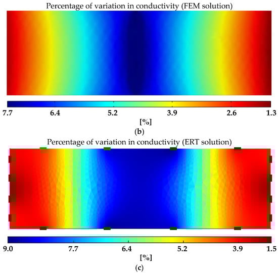 FR4 sample with the piezoresistive coating shown in Figure 6 subjected to a flexural test: (a) strain map and (b) corresponding map of the percentage of variation in conductivity simulated by COMSOL; (c) map of the percentage of variation in conductivity reconstructed from the ERT measurements.
