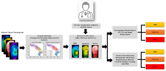 As per the above discussion, it can be seen that there is a lack of severity grading of the risk of ulcer development. The authors, including a set of expert medical doctors working in a diabetic foot clinic, stated that a foot plantar temperature distribution can help in the early detection of a foot ulcer development [50,51,52]. The scientific hypothesis of this work is whether machine learning approaches can be used to categorize thermograms into severity classes of patients with their risk of ulcer development. This severity classification can help in early treatment that could prevent diabetic foot ulcers. The improved performance of a machine learning model could help in early detection from the convenience of the patient’s home and reduce the burden on the healthcare systems, considering diabetic foot complications are very common and lead to expensive follow-up and treatment procedures throughout the world. All the above studies motivated the authors to carry out an extensive investigation on dataset re-labeling, using an unsupervised machine learning and pre-trained convolutional neural network (CNN) to extract features automatically from thermogram images, reduce feature dimensionality using the principal component analysis (PCA), and, finally, to classify thermograms using k-mean clustering [53] to revise the labels. The new labels identified by the unsupervised clusters were fine-tuned by a pool of medical doctors (MDs). Then, the authors investigated classical machine learning techniques using feature engineering and 2D CNNs with image enhancement techniques on the images to develop the best-performing classification network. The major contributions of this paper can be stated as follows: