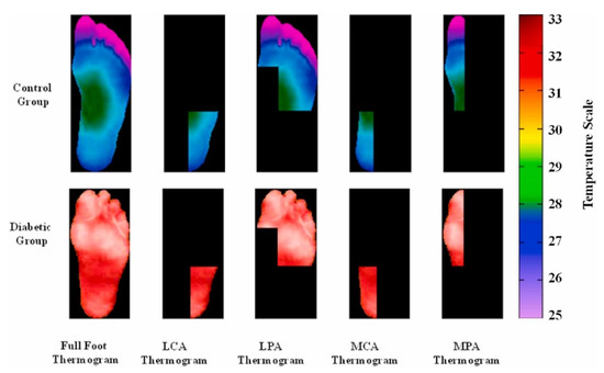 Thermography is a popular technique used to examine thermal changes in a diabetic foot [22]. This is a pain-free, no-touch, and non-invasive technique. Several studies have proposed thermogram-based techniques for the study of diabetic feet [2,3,23], which include the identification of characteristic patterns in infrared images and the measurement of changes in thermal distribution. It was reported that the control group showed a specific butterfly pattern [24], while the DM group showed a large variety of spatial patterns [25,26]. It is possible to calculate and determine an estimation of thermal changes with respect to one foot as a reference [27,28,29,30] using the contralateral comparison of temperatures. However, if both feet have temperature changes, but neither of them has the butterfly pattern, one of the feet cannot act as a reference. Asymmetry cannot be measured even if there is a large temperature difference and identical spatial distributions present in both feet. An alternative approach is to calculate the temperature change using a control group butterfly pattern [31,32,33].