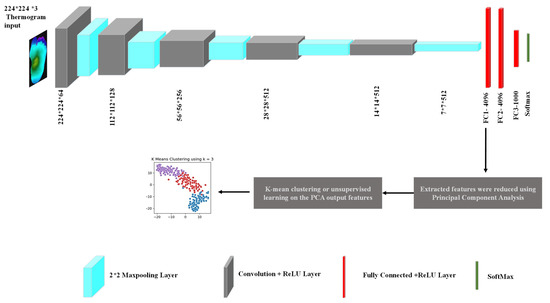 For feature extraction in our study, the popular CNN network—VGG19 was used [58]. The VGG19 network developed by the Oxford Visual Geometry Group is a popular CNN for computer vision tasks because of its high performance and relative simplicity. The detailed framework, along with network architecture, can be seen in Figure 3. The pre-trained VGG19 model was used to extract 4096 features from the ‘FC1’ layer from each thermogram image. The selection of the network layer for feature extraction was a hyperparameter in this experiment, and it was tuned to obtain the parameter that provided the best result, which is a common exercise. We empirically found out that the FC1 layer gave us the best result similar to other studies that investigated k-means clustering [59,60]. The number of features needed to be reduced so that the k-mean algorithm did not overfit and it remained robust to noise. PCA was used to transform and reduce the features such that only the most important features were retained [51]. Figure 4 shows the cumulative variance versus the number of components after PCA. It can be seen that the first 10 components provided a cumulative variance of 0.5, and after adding 90 more components, the variance rose to 0.9. Thus, significant information was retained in the initial components. In our study, we used 45 components, which helped to achieve 75% cumulative variance, which is usually an acceptable threshold in various k-mean clustering studies [61,62,63,64].
