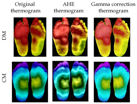 Original thermogram versus enhanced thermogram using AHE and gamma correction for DM and CG [37].