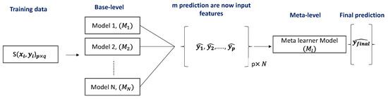 We presented a stacking-based classifier that worked by merging numerous best-performing classifiers created by different learning algorithms on a single dataset S, which consisted of examples , i.e., pairs of feature vectors () and their classifications (). A collection of base-level classifiers was trained in the first phase, where . A meta-level classifier was trained in the second step, which integrated the outputs of the base-level classifiers (Figure 6).