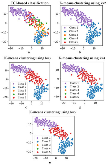t-SNE plots with the (a) TCI-based classes (class 1–class 5) and output from k-mean clustering with (b) k = 2, (c) k = 3, (d) k = 4, and (e) k = 5.