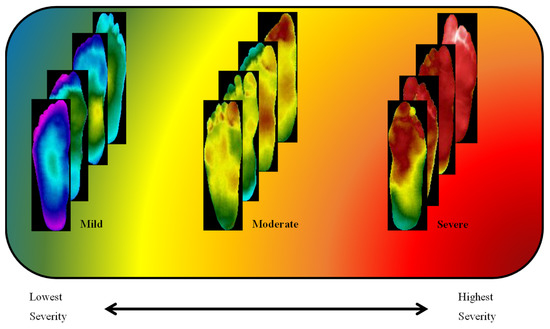 Diabetic thermograms classified into three severities: mild, moderate, and severe.