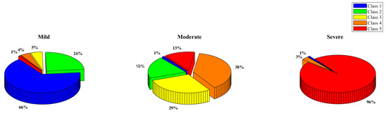 Class 1, 2, 3, 4, and 5 distribution in the K-mean clustering categories—mild, moderate, and severe.