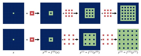 Assume that the function f is a CNN with a single donut-shaped kernel (center weight is always zero) (see Figure 3). Based on Definition 1, function f satisfies the - property because is the sum of the multiplication of the neighboring information with the donut kernel, except , for all where the size of the squared donut kernel K is always an odd number. We focus on this - function in a fully convolutional network (FCN). If only one general convolution layer is added, the invariant property is not satisfied even though the first layer may use the donut kernel. Furthermore, the receptive field of a single layer is too small to predict the correct pixel within the kernel.