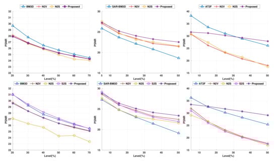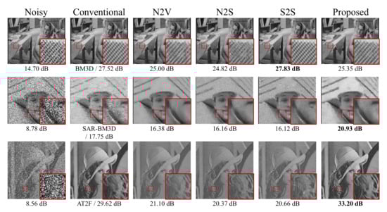 To assess the performance of the proposed method, we tested it on various noise models, such as those with additive white Gaussian noise (AWGN), speckle noise, and salt-and-pepper noise. In particular, because we focus on highly corrupted noisy images by unconventional noise in the blind aspect, the noise should be modeled by unknown distribution. To simulate this, we built a fusion noise model by mixing AWGN, speckle noise, and salt-and-pepper noise. We compared our method with several state-of-the-art blind denoising methods (N2V, N2S, and S2S). In addition, we also compared our proposed method with conventional denoising methods, such as BM3D [2], SAR-BM3D [23], and AT2F [35], known for the best performing filter-based denoising method specifically designed for each noise model. We implemented Noise2Clean (N2C) on using the same network structure as shown in Figure 2, with a regular convolution kernel for supervised training using the clean–noisy pairs introduced in Section 4.2. Please note that N2C is a supervised learning method, which serves as the upper bound for the performance of the learning-based denoising method.