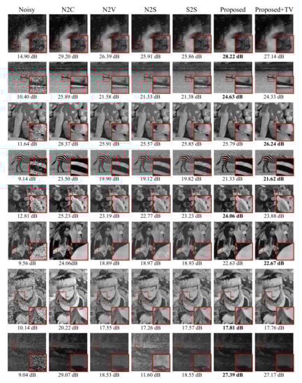 - Moran, N.; Schmidt, D.; Zhong, Y.; Coady, P. Noisier2Noise: Learning to Denoise from Unpaired Noisy Data. In Proceedings of the IEEE Conference on Computer Vision and Pattern Recognition, Seattle, WA, USA, 13–19 June 2020; pp. 12064–12072. [Google Scholar]
