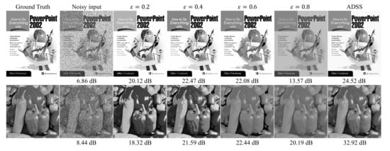 Table 3 shows the results of the previously introduced models when tested on the BSD68 dataset. It can be seen that the ADSS loss, which suppresses training from outliers, outperforms the general self-supervision loss at various levels of fusion noise except the case of = 50, = 5, and d = 5. In addition, ADSS+TV achieved higher PSNR and SSIM than the baseline and ADSS alone. As the general self-supervision loss considers all pixels to be training data, it is more sensitive to highly corrupted noisy pixels. The study result also confirms that the performance gap between baseline and ADSS is bigger for higher noise levels (). As shown in the unknown noise statistics experiment, we observed that the TV loss helped to increase PSNR and SSIM in highly corrupted images. In this ablation study, we demonstrated that the ADSS loss outperformed the general self-supervision loss. We also observed that the TV regularization was highly effective at further improving the image quality. Additionally, TV can reduce the artifact from structured noise, which is the weakness of the proposed method.