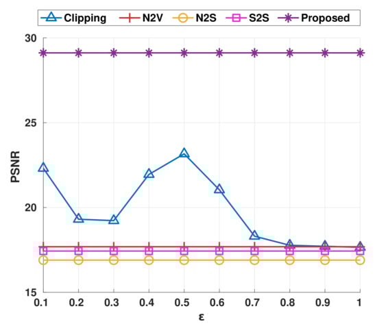 Recently, Noise2Noise (N2N) [12] proved that training a deep learning model is feasible and that the expected value of noisy inputs could be equal to the clean target. However, in situations where the noise statistics are unknown, N2N is impractical because of the difficulty in collecting a noisy pair for the same target. With only noise statistics, these works [31,32] perform as well as or slightly better than supervised learning. For instance, Ref. [31] suggest concrete self-supervision losses suitable for each noise statistic, but it is difficult to apply the proposed loss in cases with unknown noise statistics. Ref. [31] also presented a new blind-spot network that contributes similar to the architecture presented in the present study. However, we take a different approach to enabling self-supervision learning using the - property. Similarly, Noisy-As-Clean (NAC) [32] suggested a training scheme with pairs of noisy images x and where is a simulated noise. The researchers demonstrated that loss function can be embedded into supervised learning. Noisier2Noise [33] presented a novel training approach with only a single noisy realization and noise statistics. It also overcomes the drawback of N2N that is the requirement of a prior of noise distribution. Moreover, the Noisier2Noise approach is applicable to spatially structured noise, one of the main disadvantages of a blind denoising method.