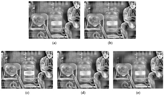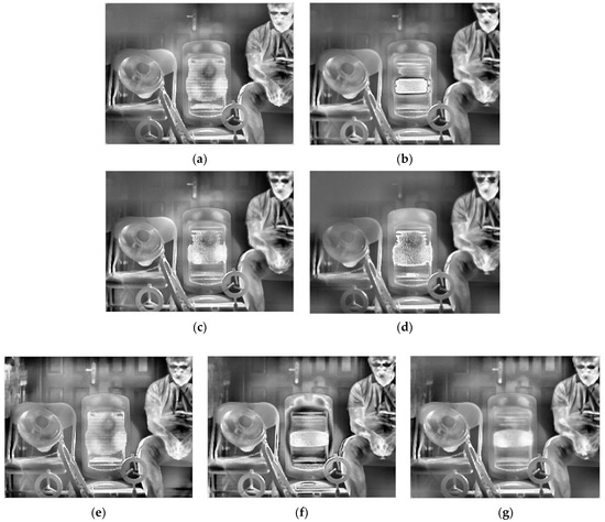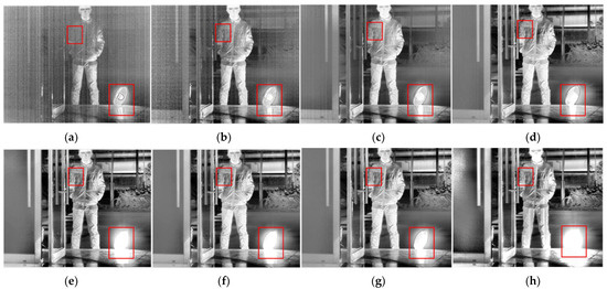 Table 2 gives the selected integration time of the five methods. After thermal imaging, selection, fusion, and enhancement processing, the final results of the three sets of scenes are shown in Figure 13, Figure 14 and Figure 15.