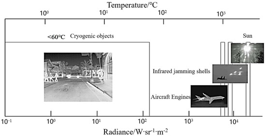 In practical infrared applications, when strong radiation targets (such as the sun, flames, or jamming bombs) exist simultaneously with ambient targets, the radiation brightness spans a large range. Furthermore, for the current 14-bit analog-to-digital (A/D) cooled IR focal plane array (IRFPA) thermal imaging systems, even without considering the non-linearity of the S-shaped response curve, the equivalent dynamic range is only approximately 84 dB [1]. The dynamic range is much smaller than that of the natural scene’s differences in radiation. This means underexposure or overexposure cannot be avoided, even if the imaging parameters of the system are adjusted. Moreover, all details of the scene cannot be captured at once, and this will have a very negative influence on several target detection and identification tasks. Hence, it is necessary to propose a high-dynamic-range (HDR) imaging method to accommodate effective imaging of the full radiation scene.