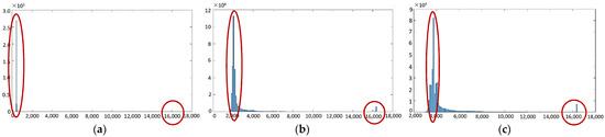 Histogram of the grayscale distribution of single-integration time-based IR images: (a) 13 μs; (b) 665 μs; (c) 1330 μs.