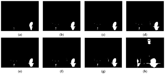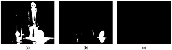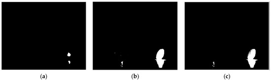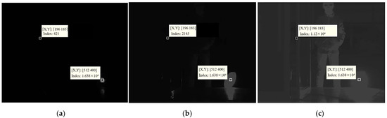 As mentioned earlier, the grayscale difference of pixels in the ambient-temperature region is not large, so the second coefficient, (less than 1), is used, which determines the range from the “seed” grayscale to the high-temperature grayscale. This means that the pixels with a slightly larger grayscale than the seed point should also be considered as part of the ambient-temperature region, but this range does not exceed the grayscale of the seed point itself. When the integration time increases, the grayscale of the ambient-temperature region increases, but the high-temperature region is basically in a saturated state, with little change in grayscale, and the second coefficient decreases accordingly. It means that the range is being defined as the ambient region decreases, which avoids the error of pixels in the high-temperature region being divided into the ambient-temperature region under high integration time. As shown in Figure 7, for an image with 1995 μs, the pixels with grayscale smaller than 1.74 times that of the seed point can be defined as the ambient-temperature region, and a good segmentation effect is achieved, as shown in Figure 7b. However, if 1.2 times is used, the ambient-temperature region (e.g., the clothing) is also defined as the high-temperature region, as shown in Figure 7a; if 3 times is used, almost all pixels are defined as the ambient-temperature region, as shown in Figure 7c.