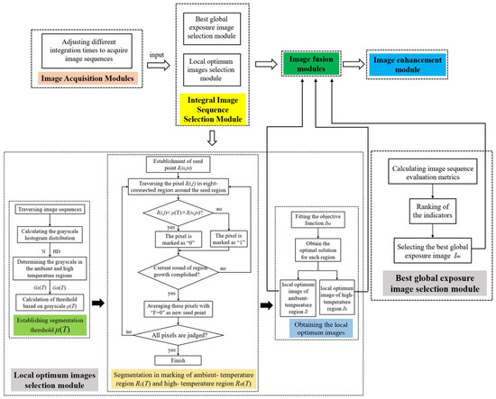 For HDR imaging, the high-temperature/low-temperature target scene region and the ambient-temperature region need to be studied separately; except for the local effect, the continuity of the entire scene should also be considered. Therefore, we propose a multi-integration time adaptive selection method based on grayscale information, shown in Figure 10. The whole image processing process is divided into four modules: the image acquisition module, the integral image sequence selection module, the image fusion module, and the image enhancement module. The integral image sequence selection module involves the selection of local optimum images and the selection of the best global exposure image, and it is worth noting that the two processes can be carried out in parallel or vertically.