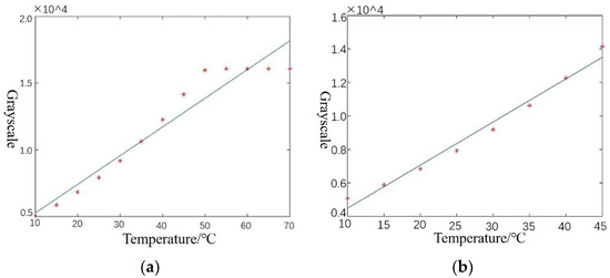A blackbody-based nonuniform correction is required prior to the operation of the thermal imaging camera to eliminate the differences in the response of the detector image elements. The specific operation process involves using the thermal imaging camera to visualize the blackbody. To ensure the blackbody is in a stable working condition, its temperature should not be much less than the ambient temperature, nor should it exceed 100 °C. The blackbody temperature should be controlled, starting from 10 °C and gradually increasing to 70 °C, in 5 °C steps. The upper and lower thresholds of the integration time depend on the thermal imaging camera. When most of the pixels of the blackbody image are saturated, the integration time has reached the upper limit; when the blackbody image cannot be displayed, the integration time has reached the lower limit. The blackbody sequence images at different temperatures and integration times were acquired. The mean grayscale value of a single image was calculated. The temperature-grayscale curves corresponding to different integration times were fitted using MATLAB software, where temperature and grayscale were approximately proportional, and a straight-line fitting method was chosen. Next, we found the two temperature values that fit best and considered their corresponding mean grayscale values as the standard grayscale values, so that the correction coefficients for each pixel could be calculated. The gain and bias coefficients are required for the pixel to obtain the corresponding standard grayscale values. In addition, outliers resulting from pixel saturation need to be removed. As shown in Figure 12, if the saturated image produced by excessively high temperature is not eliminated, the linear fitting in Figure 12a will select the two temperatures with the highest fitting degree, 15 °C and 35 °C, denoted as (15, 35); after removing the saturated image, the linear fitting at this integration time becomes that seen in Figure 12b, and the two temperatures with the highest fitting degree, 15 °C and 40 °C, are selected, denoted as (15, 40). The cooled mid-wave thermal imaging camera ImageIR8355′s integration time sequence is: 5, 8, 11, 13, 20, 27, 40, 53, 67, 80, 93, 106, 133, 200, 266, 332, 399, 466, 532, 665, 798, 931, 1064, 1197, 1330, 1596, 1862, 2128, and 3990 μs. The cooled mid-wave thermal imaging camera Jade’s integration time sequence is as follows: 50, 100, 200, 300, 400, 500, 600, 700, 800, 900, 1000, 1100, 1200, 1300, and 1400 μs.
