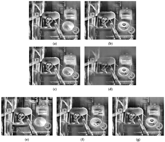 HDR fusion results for scene 2 with different selection methods: (a) single integration time (900 μs); (b) ES; (c) EI; (d) MGD; (e) MW&EN; (f) ME; (g) proposed.