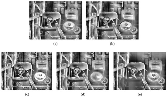 Fusion results of five typical fusion methods for scene 2: (a) Mertens; (b) Vonikakis; (c) Ma; (d) Kou; (e) MIF&DE.