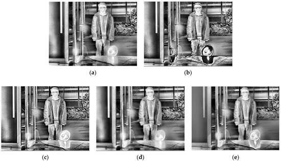 Typically, IR focal plane detectors have an ‘S’-shaped response curve, where the normal response of the IRFPA corresponds to a certain temperature range when the integration time varies, as in Figure 1a. When multiple LDR images with different integration times are fused, the response curves are stitched together to obtain a larger range of temperature-response output curves, as in Figure 1b. Clearly, the choices of appropriate integration time and appropriate LDR image sequence fusion method are the critical factors affecting the dynamic range and imaging quality of the fused images. If the integration time interval is small, the expansion of dynamic range performance is not obvious. If the normal response part of the response curve corresponding to each integration time is stretched in grayscales according to the mapping relationship, the “S”-shaped response curve is transformed into an approximately linear function, resulting in a fused image that is equivalent to the acquisition of a larger temperature range at one integration time; the linear extension of the dynamic range of the infrared image is achieved. This method is often used in HDR thermometric imaging, as the target’s temperature in the actual scene is often discontinuous, especially in the presence of strong radiation targets (such as the sun, interference bombs, etc.). The use of linear fusion requires a higher number of LDR images. In IR imaging, there is no need to maintain the linearity of radiation. With the use of non-linear fusion based on pixel grayscales, gradient can be used [16,17,18,19,31] to reduce the tedious process of acquiring images for thermal imaging systems.