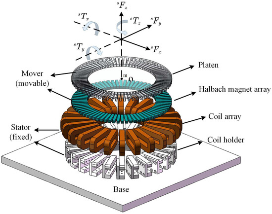 In this section, the dynamics of the MLRT are analyzed. As shown in Figure 1, the MLRT consists of a circular Halbach permanent magnet (PM) array and 8-phase coils (3 coils for each phase) which can be divided into eight actuator units. Calculation of the magnetic force and torque in an actuator unit is the basis for establishing the magnetic force model of the MLRT. According to the calculation method stated in [25], the magnetic force of an actuator unit is presented in the function related to the position of the table. With the left superscript representing the vector or variable defined in the certain coordinate system, including the magnet coordinate system , the coil coordinate system , and stator coordinate system , the magnetic force is solved by