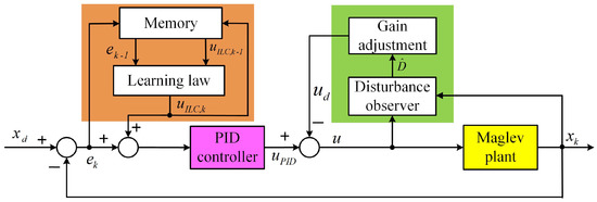 To achieve remarkable tracking performance, a hybrid control structure LPIDDC is proposed as shown in Figure 2. The LPIDDC control strategy consists of three parts: PID term, DC term, and ILC term. In the LPIDDC framework, the PID term is responsible for the stability of the maglev system. The DC term is designed based on the plant model, which can effectively estimate and inhibit the disturbance. The ILC term generates the optimal input to change the reference of PIDDC through previous control experience and tracking error, so that the effect of unmodeled repetitive disturbance is reduced. Compared with the conventional feed-forward–feedback control, for example LPID, the DC term not only enhances the disturbance rejection capability, but also eliminates the system errors which cannot be totally removed by the ILC. The LPIDDC control framework offers an effective motion control technology scheme for the industrial application of the maglev system and also supplies a meaningful idea for control engineers.