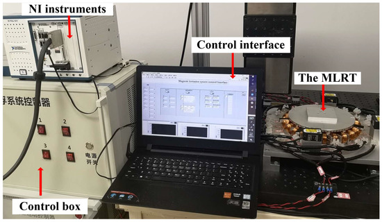 In order to test the performance of the proposed control algorithm, including disturbance rejection and trajectory tracking performance, a series of comparative experiments are carried out on the MLRT given in Figure 3. Six laser-displacement sensors are employed to obtain the position and rotation informations of the rotary table. To reduce the impact of measuring noise on the system, the median filter algorithm processes the raw data from the sensors. The currents exciting the coils are provided by eight independent power amplifiers with current limitation of . The control strategies for the MLRT are implemented on the data processing platform NI PXIe-8880 and a reconfigurable I/O module NI PXIe-7856R, which are manufactured by National Instrument. Six channels of PXIe-7856R are configured as analog input to collect the sensors’ signals and the other eight channels are configured as analog output to drive these power amplifiers. The NI PXIe-8880 realizes the certain control algorithm when it receives the operation commands from the PC. Additionally, the sampling frequency of the control algorithms running on NI PXIe-8880 is 1 .