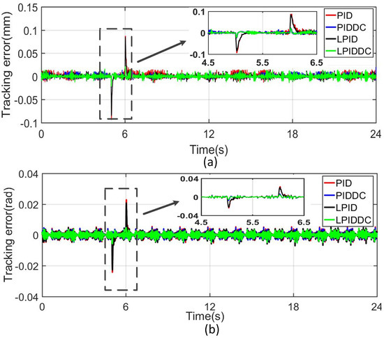 Tracking results of Track1 and Track2 with step disturbance. (a) Tracking error in -axis. (b) Tracking error in -axis.