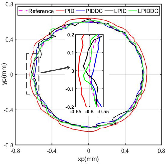 The tracking error of M1 is large due to the fact that the PID controller cannot reject the motion coupling of the multiple axes tracking effectively. Although M2, M3, and M4 all achieve smaller tracking errors than M1, M4 still has the best trajectory tracking performance as the of M4 is , , and of M1, M2, and M3, respectively, wheresa that of is , , and . From the partial view in Figure 10, the LPIDDC contour is more closed to the desired circle than others. Based on the above experimental results, we can conclude that the proposed control strategy is effective for the planar motion of the magnetic levitation rotary table.