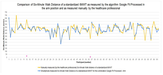 In Figure 4, the six-minute walk distances (6MWDs), as measured during the random walk 6MWT by the smartphone with the algorithm Google Fit Processed with the smartphone mounted in a strap around the patient’s arm, and as measured during the standardized 6MWT manually by the healthcare professional, are depicted for each participant. For most participants, the 6MWD measured by the healthcare professional during the standardized 6MWT and the 6MWD measured by the algorithm Google Fit Processed in the arm position during the random walk 6MWT are extremely close to each other or even overlapping, indicating that the smartphone-measured 6MWD is fairly accurate. For this algorithm–smartphone position combination, there are only two outliers. Missing values for this combination of algorithm–smartphone position are indicated by no dot for the participant (e.g., participant 5).