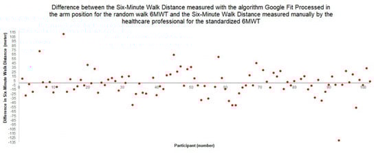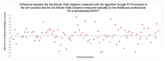 Figure 5 depicts the Bland–Altman plot, showing the difference between the 6MWD measured by the algorithm Google Fit Processed in the arm position during the random walk 6MWT, and the 6MWD measured manually by the healthcare professional during the standardized 6MWT. The difference in meters between the healthcare professional-measured, standardized 6MWD and smartphone-measured, random walk 6MWD for this algorithm–smartphone position combination is at most 111.2 m. Relative to the total distance walked during the random walk 6MWT, which is minimally 262.1 m and maximally 635 m, this difference is acceptable. Furthermore, for most participants, the difference is significantly smaller, indicated by the dots in the Bland–Altman plot (Figure 5) being close to 0.