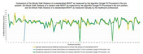 The algorithm Google Fit Processed with the smartphone worn in a strap around the patient’s arm produced the smallest mean absolute error, the best median error, the minimum standard deviation, and the minimum error rate. As a result, we can conclude that among the algorithms that we included in this study, the algorithm Google Fit Processed with the smartphone mounted on the patient’s arm provides the most accurate 6MWD for a smartphone-measured, random walk six-minute walk test.