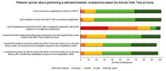 Next, we assessed patients’ opinion about using a smartphone application to perform a self-administered 6MWT at home (e.g., do they find it reliable to use a smartphone app to perform the 6MWT). Again, we used 5-point Likert scale questions, ranging from strongly disagree to strongly agree (Figure 8). It is notable that only five out of the 102 participants did not want to use a smartphone application to perform a 6MWT. Most patients think it is reliable and are not afraid to perform a self-administered, smartphone-based 6MWT without the supervision of a healthcare professional. We observed no clear difference in the moment (during or after finishing the rehabilitation program in the rehabilitation center) at which patients would find it more useful to perform a home-based 6MWT to follow up on their physical fitness. Patients would like that their healthcare professionals (e.g., cardiologist or physiotherapist) follow up the results of the 6MWTs that they perform at home. Lastly, we want to note that the negative and neutral responses regarding the usage of a smartphone application to do a 6MWT might be due to patients’ unfamiliarity with technology and smartphones in particular, or their unwillingness to follow up their physical fitness using a smartphone application.