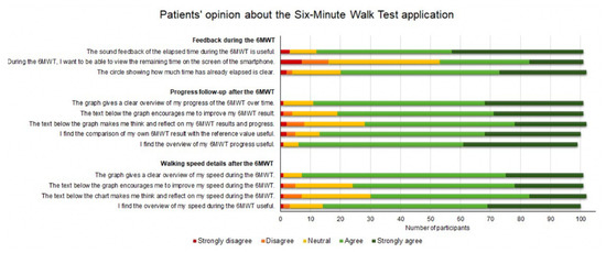 Lastly, we should also extend the 6MWT application to support patients in interpreting the results of their 6MWT. As indicated by the results of the questionnaire, some patients are unsure about what the result of their 6MWT means. The 6MWT application should include features that enable patients to interpret their results and follow up on their progress. We also assessed patients’ opinion about possible features for a 6MWT application. The results indicated that patients prefer to have features that provide feedback during the 6MWT, enable progress follow-up after the 6MWT and depict walking speed details after the 6MWT. We suggest that these features are included in the 6MWT application. The 6MWT is also used as an important assessment tool in other (chronic) diseases, e.g., neurological diseases. In this context, our elaborated 6MWT application could be interesting as well.