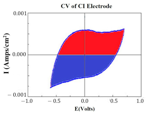CV of CI electrode. Image is taken from CorrView (Scribner Associates, Southern Pines, NC, USA). The CV is graphed as I (current) vs. E (voltage). The Q value is an estimate of the average of the area of the red region and the area of the blue region.