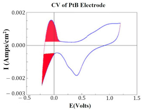 At key points in the study, CVs were generated for each HCM electrode to determine their “Q” value. The CVs were generated using a Solartron Inc. (Farnborough, UK)., Model 1280B Potentiostat, using a BASi (West Lafayette, IN, USA) RE5B reference electrode (measurements are accurate to within 10 mV) with a sweep rate 10 mV/s, voltage range of −0.255 to +1.20 V, and sampled at 10 Hz. Both PtB and CI required different methods of CV analysis. The Q value was estimated for PtB electrodes by calculating the pseudocapacitive charge associated with hydrogen adsorption/desorption by integrating the current in each of these regions and calculating the average area of the two regions. The CI electrodes’ Q value represents the capacitive region and is estimated by integrating the charge/discharge regions of the CV and calculating the average area of the two regions. Figure 1 and Figure 2 demonstrate obtaining the Q value from the CVs of CI and PtB high-capacitance electrodes.