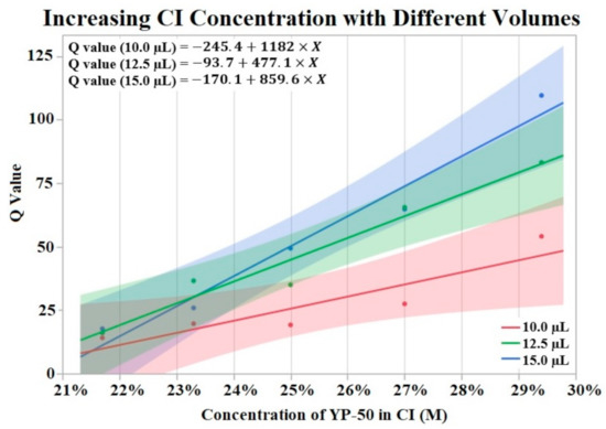Figure 3 visualizes the results of Q value vs. concentration of activated carbon powder (YP-50) by groups of differing volumes of CI. The Shapiro–Wilk test supported normality (p > 0.05) of the data set. A one-way ANOVA found a significant effect (p = 0.0076) of CI concentration on Q value irrelevant of volume. No significant effect was found from volume on Q value per a one-way ANOVA (p > 0.05). Trend lines were applied to the data points revealing an upward trend from increased powder concentration.