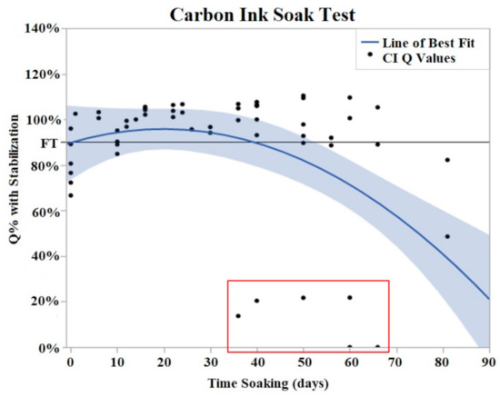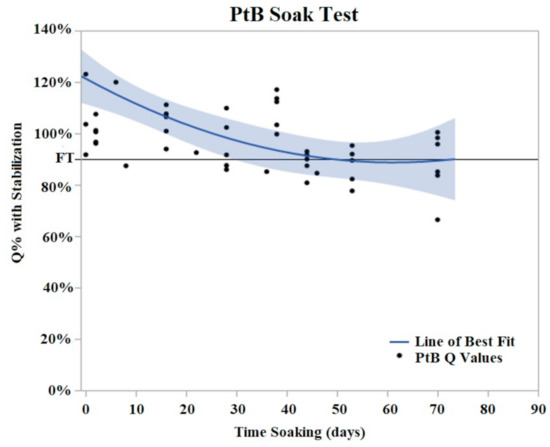 PtB soak trials were plotted as Q% with stabilized vs. time soaking (days) in. Stabilized values were derived from initial Q value analysis. A quadratic line of best fit was fit to the data (Y = 0.8979 + 0.00605x − 0.000152 × 2). The horizontal line at 90% represents the failure threshold. α = 0.05.
