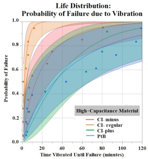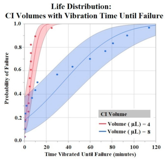 The Shapiro–Wilk test did not support normality (p < 0.05) of the data set. A one-way ANOVA found significant effects of both HCM material (p = 0.0256) and CI volume (p = 0.0489) on vibration time until failure (90% Failure threshold). Using a p < 0.05 criteria for significance, a comparison of means by a Student’s t test on HCM groups found significant differences between PtB vs. CI-regular (p = 0.0148) and CI-plus vs. CI-regular (p = 0.0161). There were no significant differences between CI groups: PtB vs. CI-minus, PtB vs. CI-plus, CI-regular vs. CI-minus, and CI-minus vs. CI-plus (p > 0.05). CI-regular electrodes failed significantly sooner than PtB and CI plus. If an electrode had a CI volume of 4 μL it failed significantly failed sooner than an electrode with a CI volume of 8 μL. Statistical analysis by one-way ANOVA and Kruskal–Wallis test found no significant statistical effect of Nafion™ or 1st trial vs. trials 2–5 on vibration time to failure (p > 0.05). HCM and CI volume life distribution analysis are contained in Figure 7 and Figure 8.