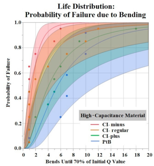 The Shapiro–Wilk test did not support normality (p < 0.05) of the data set. A Kruskal–Wallis Test found a significant effect of HCM groups on the number of bends until failure (p = 0.0360). Comparison of means by Student’s t test for HCM groups found significant differences between CI-minus vs. PtB (p = 0.0339) and CI-minus vs. CI-plus (p = 0.0204). Statistical analysis by one-way ANOVA and Kruskal-Wallis test found no significant effect of CI volume, Nafion™, or 1st trial vs. trials 2–5 on bends until failure (p > 0.05). Figure 9 is a life distribution analysis between HCM groups.