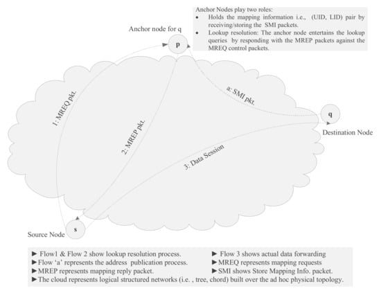 Lookup phase and actual data forwarding: To send a data packet, a source node s retrieves the destination node q’s LID from q’s AN, i.e., node p, (Flow 1 and Flow 2 in