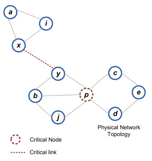 Figure 3, the link(x,y) is said to be k-hop critical if its failure leaves node x and node y with disjoint k-hop neighboring nodes. For k = 1, the link(x,y) is 1-hop critical because 1-hop neighbors of node x and node y are disjoint. For k = 2, the link(x,y) is 2-hop critical, as there exist no common neighbors in the 2-hop neighbors of node x and node y. In this manner, the link(x,y) is considered a globally critical link because for k ≥ 1 there exist no common neighbors at all. Likewise, node p in