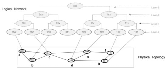 Key-invariant: Adjacent nodes in the logical network (i.e., address tree) share a common prefix and represent a connected sub-graph in the physical topology. In other words, non-empty adjacent (i.e., with common prefix) sub-trees must be connected in the physical topology.