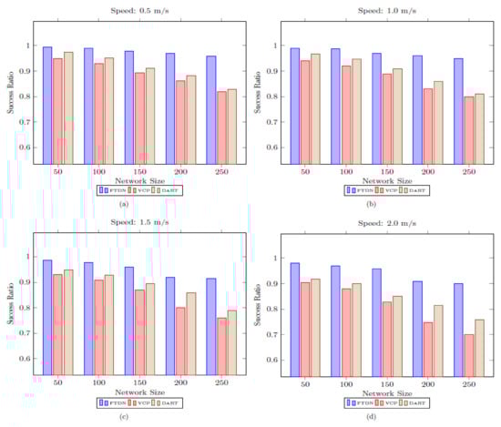 Figure 7a–d show the results at speed 0.5 m/s, 1.0 m/s, 1.5 m/s and 2 m/s respectively). FTDN gains are significant as compared to DART and VCP. Since, in FTDN, the lookup queries are resolved by the nearby replicas despite being far from actual AN. Similarly, in case of actual AN failure or partition, the mapping information remains accessible comparatively at shorter distances than the original AN. Moreover, resolution of lookup requests by the nearby replicas instead of the designated AN reduces transmission overhead in FTDN. Eventually, this decreases contention at the MAC layer (i.e., in IEEE 202.11); these factors further reduce E2E lookup delay in FTDN compared to VCP and DART. Similarly, high mobility compromises network connectivity (links) and increases the probability of nodes/links failure and the existence of more critical nodes in the network. Therefore, FTDN deploys more replicas (i.e., since, in FTDN, replication decisions consider network dynamics and adaptively replicate mapping info across the critical regions) and, the lookup queries would get resolved by the nearby replicas, even in highly mobile environments. So, FTDN is a better choice for highly mobile environments. However, a slight increase in overhead and delay due to recurrent partition detection and merging schemes. However, the case is different in VCP and DART since VCP does not consider physical network dynamics in the replication process and offers no resistance to mobility. Specifically, in highly mobile environments, the restricted ring search used in VCP not only fails to discover replicas but introduces massive delay due to the false attempts by locating the replicas. Similarly, in DART, due to frequent failures (nodes/links, partition, etc.), more and more lookup queries are needed to be buffered; this causes a buffer overflow, and the forwarded lookup quarries get lost before reaching the new selected AN. This worsens with an increase in network size (i.e., an increase in network size also increases average shortest path length; therefore, SMI packets have to cover longer distances in periodic updates. Therefore, VCP and DART encounter considerable delays in the lookup process as mobility and network size increase. However, for small networks with low mobility, DART outperforms VCP.