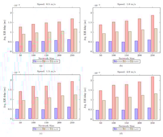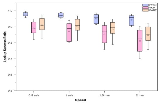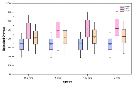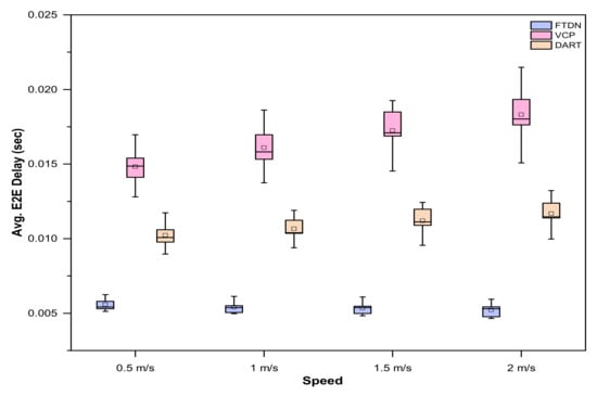 Figure 8 provides E2E delay comparison using boxplots against different nodes speed with varying network size. The data distribution further endorses FTDN’s significant gains.